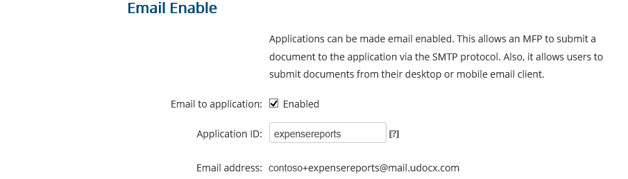Click the “Email Enable” check box, then provide a unique Application ID for this Udocx application (you will see the email address changing in real time). The final email address is constructed from the ‘SMTP prefix’, the ‘+’ sign, and the ‘Application ID’, @mail.udocx.com.